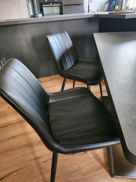 Stühle sind mit hochwertigen Kunstleder bezogen und haben schwarze Metallbeine.
