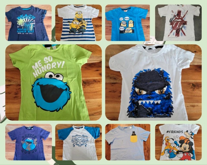 Alles in Größe 110/116. Nur T-Shirt mit Micky Maus ist 116. Alle Teile für jeweils 1,50 Euro. Das T-Shirt mit Batman hat einen Fleck (s. Fotos) und gibt es bei Abnahme von mindestens vier Teilen gratis dazu.