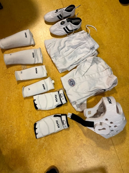 Ich verschenke ein Taekwondo Trainingsset besteht aus Oberteil und Hose in Größe 2/160, Schuhgröße leider nicht ersichtlich, geschätzt circa 36/37, Schützer, Helmgröße M.