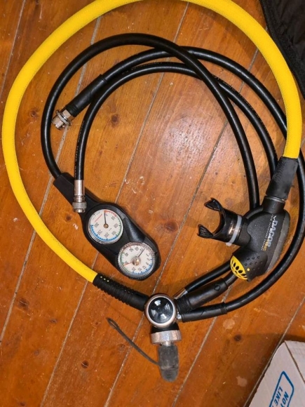 Biete verschiedene Tauchsachen an, siehe Bilder. Erste Sufe mit Druckmesser und Anschluss für Trocki, Tauchrucksack, 2 Halbtrocken Tauchanzuge, Tauchcomputer, Geräte Flossen. Jackett .