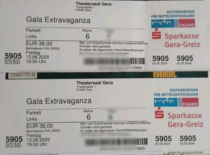 Für heute 19:30 Theater Gera, 2 Karten Gala Extravaganza seid Monaten ausverkauft bis 13 Uhr abzugeben und abzuholen in Gera. Aus gesundheitlichen Gründen. 60 Euro der Preis.