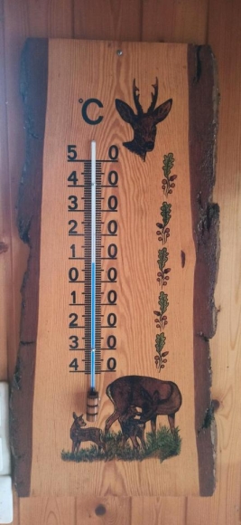 Innen Thermometer mit jagdlichen Motiven auf Holz.