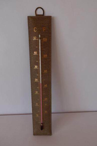 Thermometer für innen, helles braunes Kunstleder mit goldener Schrift, sehr gut lesbar, Rückseite schwarzes Holz, mit Celsius- und Fahrenheitskala,