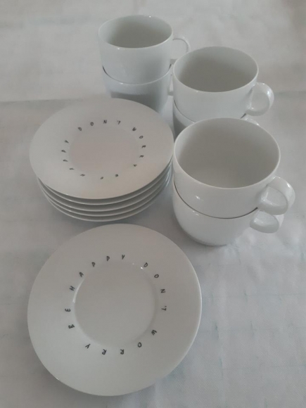 Ich verkaufe 6 unbenutzte große Porzellan-(Milch)kaffeetassen der Marke Thomas jeweils mit Untertassen der Marke Living. Die angenehm großen, geraden Tassen sind nicht mehr im Fachhandel zu bekommen. Sie haben einen Außendurchmesser von ca. 9,5cm, eine Höhe von ca. 7cm und fassen ca. 0,33ltr.. Die seinerzeit zugekauften „Living“-Untertassen haben einen Durchmesser von 16cm und tragen das motivierende Tagesmotto „Don`t worry be happy“. Die Sets sind einfarbig weiß und absolut mängelfrei. Unser Haushalt ist rauchfrei. Bei Übernahme der Portogebühren würde ich die Ware gut verpackt und versichert zuschicken. Zahlung per Paypal ist möglich. Dies ist ein Privatverkauf, deshalb kann ich keine Garantie nach neuem EU-Recht übernehmen. Der Verkauf geschieht unter Ausschluss jeglicher Gewährleistung, Garantie und Rücknahme. Der Käufer erklärt sich damit einverstanden und erkennt dies mit dem Kauf an.