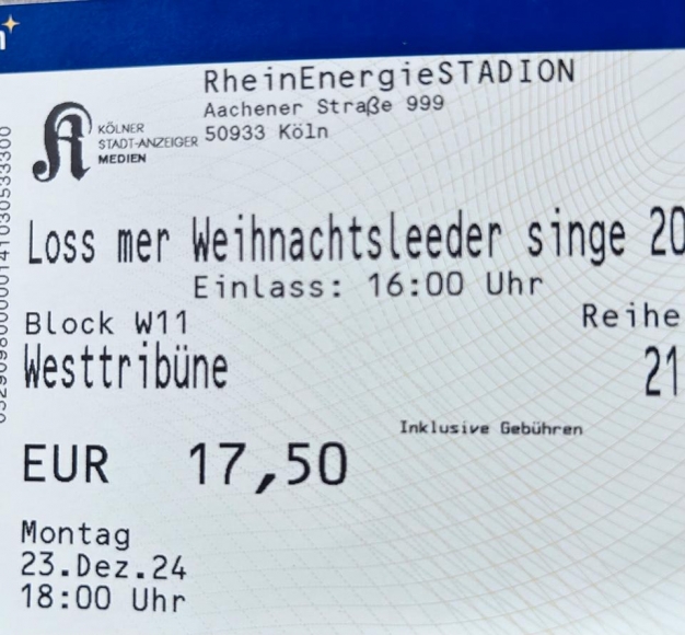 1 Ticket für das ausverkaufte “Loss mer Weihnachtsleeder singe” Weihnachtssingen im RheinEnergie Stadion.
