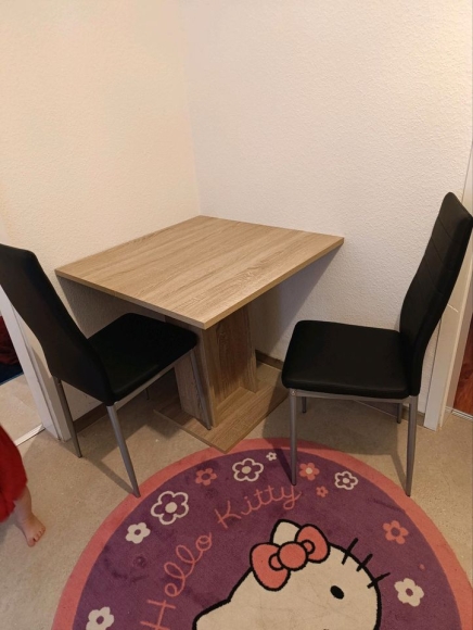 Verkaufe hier ein Tisch in den Maßen 80x80 cm und zwei Stühle in Lederoptik (schwarz). Die Sachen sind in einem gepflegten Zustand und heile.