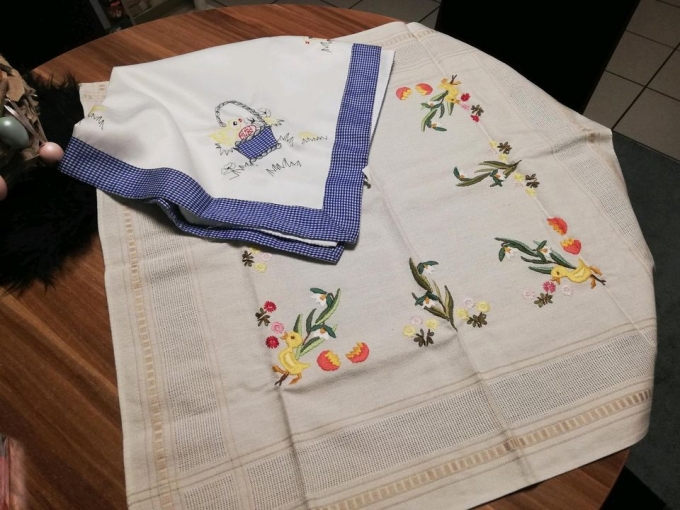 Sehr schöne Handgestickte decke passend für den Ostertisch und eine Decke blau/weiß 100% polyester gr 83/83 und die beige 75/75 gerne zusammen kein Versand