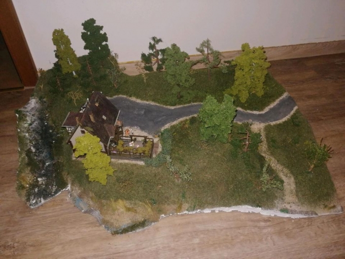 TOP Diorama HO/1:87 Vollmer Gasthof zum Adler Berg Felsen See und viele Figuren, teils handgefertigte Bäume aus Anlagenabbau.