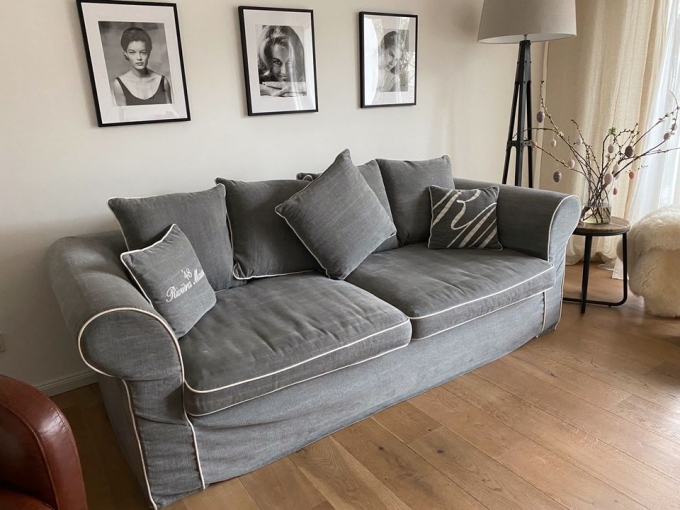 Biete traumhafte und elegante Couch von Riviera Maison in grau und weiss abgenähten Kissen. Bis auf einen kleinen weissen Fleck sehr guter Zustand. NP ca. 2500 Euro.