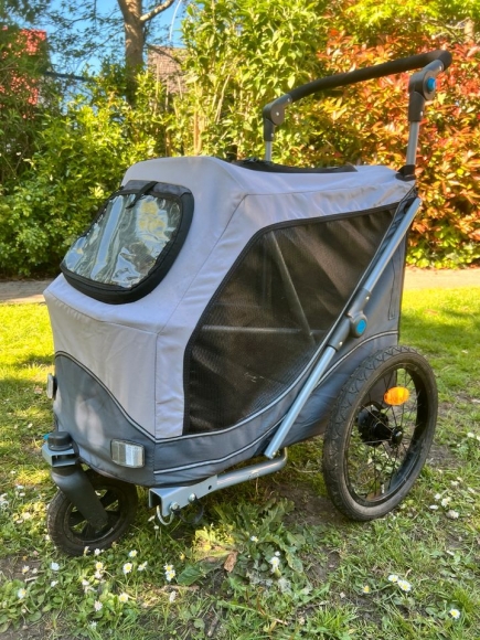 Verkaufen ein sehr wenig genutzten Trixie Fahrrad-Anhänger in Gr. M, faltbar, sehr guter Zustand. Hatten ihn nur kurz für unseren Welpen genutzt.