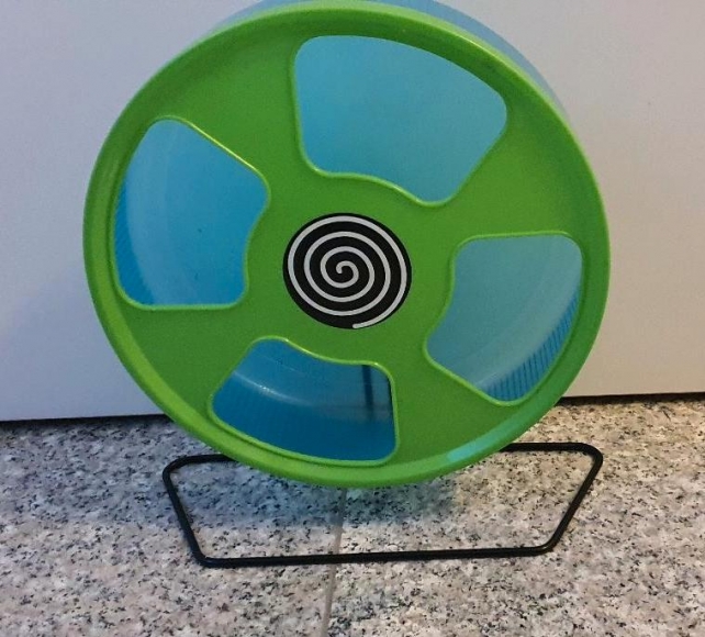 Zum Verkauf kommt ein gebrauchtes, sehr gut erhaltenes Laufrad für Mäuse. Durchmesser ist ca. 28 cm, Gesamthöhe ca. 32 cm.