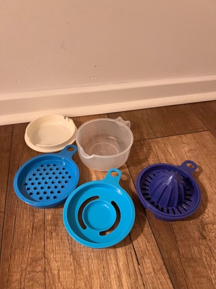 Ich verkaufe die Küchenperle von Tupperware. Sie ist sehr praktisch, da sie 3 unterschiedliche Funktionen hat. Einmal eine Zitronenpresse, ein Eitrenner und eine Reibe für z. B. Zitronenschale. Ich habe sie nur einmal verwendet. Daher ist der Zustand super :)