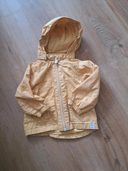 Die Jacke ist gelb mit weißen Punkten und die Kapuze ist abnehmbar.
