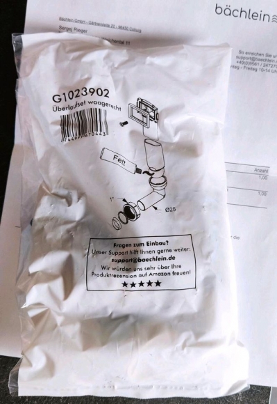 Neues Überlaufset von Bächlein. Neu, ausgepackt, aber dann doch gegen die Installation entschieden.