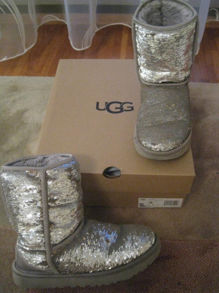Tolle Original UGG Stiefel mit Wendepailetten, Farbe silber/gold Metallic-Optik. UGG CLASSIC SHORT SEQUIN COSMOS. Ein echter Hingucker für junge modebewußte Damen! Wie bei UGG üblich, mit Lammfell gefüttert, auch die Decksohle, so daß die Füße - sogar barfuß! - schön kuschelig warm sind. Treadlite by UGG™ Laufsohle, die Stiefel sind wirklich leicht. Finde, die Stiefel fallen kleiner aus, meine Tochter hat sie bei Gr. 35 getragen, bei Gr. 36 waren sie zu klein, die Herstellerangabe ist Gr. 36. Wird im Originalkarton verschickt. NP war seinerzeit 220 EUR!