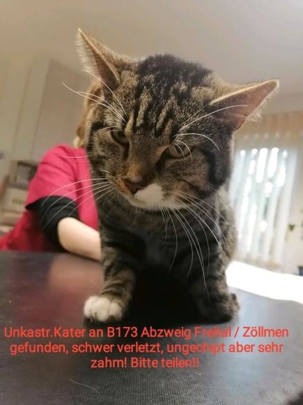 Gut genährt, unterkühlt, ungechipt, unkastriert, gefunden an B173 Abzweig Freital / Zöllmen, schwer verletzt