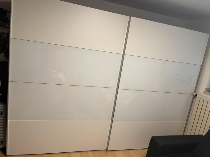Zum Verkauf steht ein eleganter und geräumiger Kleiderschrank mit zwei großen Schiebetüren in Hochglanz Weiß. Der Schrank bietet viel Stauraum und passt dank seines modernen Designs ideal in jedes Schlafzimmer oder Ankleidezimmer.