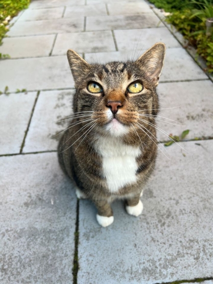 Er ist 10 Jahre alt, kräftig gebaut, eher scheu und hat weiße Pfoten und grüne Augen. Er ist kastriert, jedoch nicht gechippt.