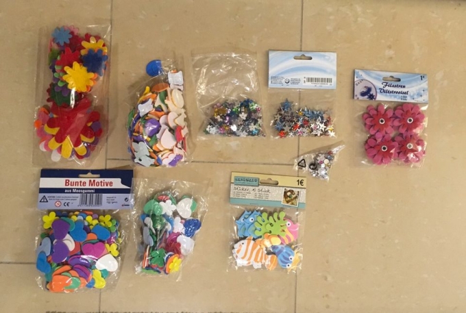 Verschiedene Bastelmaterialien, Schmucksteine, Buchstaben…