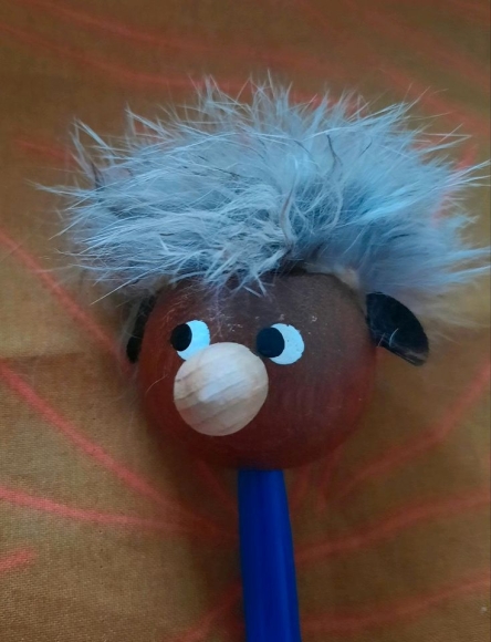 Echtes Teakholz mit Lederöhrchen und Haaren aus Kaninchenfell.