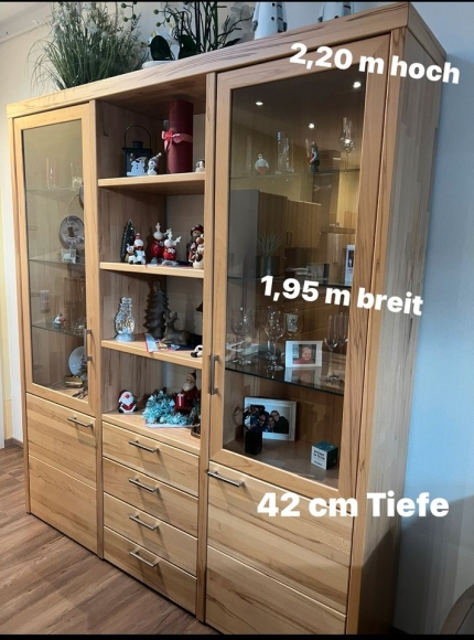 Ich biete hier einen Vitrinenschrank der Firma Wöstmann, den wir vor 4 1/2 Jahren bei der Fa. Segmüller gekauft haben, zum Verkauf an. Der Schrank ist sehr gepflegt und hat auch keinerlei Beschädigungen. Er ist aus massiver Kernbuche verarbeitet. Im oberen Bereich sind jeweils drei Glasböden eingesetzt und hinter den unteren Türen jeweils ein massiver Holzboden drin. Der Neupreis betrug damals circa 4000 €. Wir verkaufen den Schrank allerdings ohne Dekoartikel.