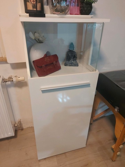 Schöner kleiner Schrank, kann man auch andersrum an die Wand montieren.