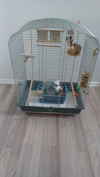 Verkaufe gebrauchten Vogelkäfig mit 54 cm Breite x 72 cm Höhe x 38 cm Tiefe inkl. Zubehör wie Stangen, Spiegel und Spielzeug lt. Bild.