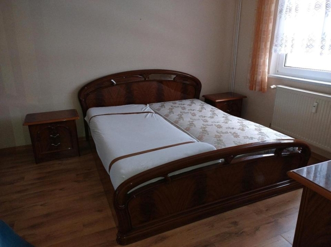 Ein Doppelbett+2 Lattenroste, 2 Nachtschränke und eine Kommode.