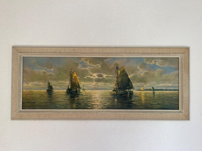 W. Hahn – Stimmungsvolles Gemälde „Fischerboote bei Sonnenuntergang“ mit Rahmen & Signatur
