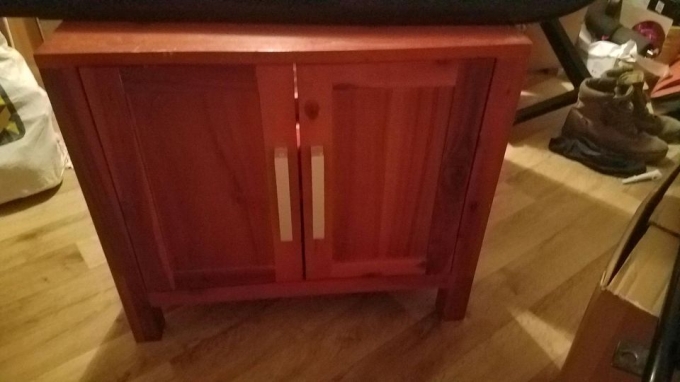 Hochwertiger Waschbeckenunterschrank aus Massivholz. Hübsche Farbe. Türen gehen mit Magneten zu. Ein Regalbrett drin. Passt leider nach Umzug nicht mehr unters Waschbecken.