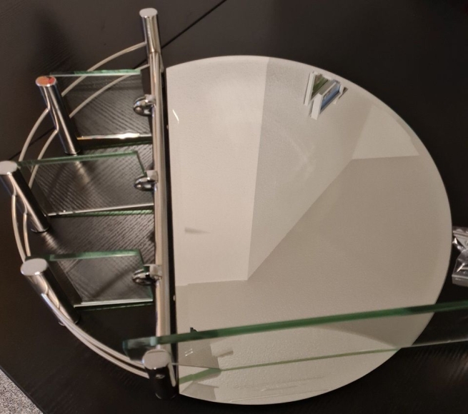 Runder Spiegel (D=55cm) mit Glasbord (45x12 cm) unten vor dem Spiegel, an der Seite 2 Borde (11,5x12 cm) und 1 Bord (15x12cm)