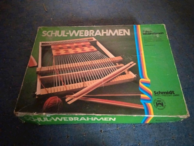 Hier verkaufe ich einen alten aber intakten Schulwebrahmen. Ich habe zur Veranschaulichung die Schiffchen mit Wolle beladen und einige Bahnen gewebt. Der Webrahmen ist von Firma Schmidt und schon recht alt aber voll funktionsfähig. Nur der Karton ist nicht mehr so schön. Webbreite 24 cm. Für ein buntes handgefertigtes Wolldeckchen und Co.