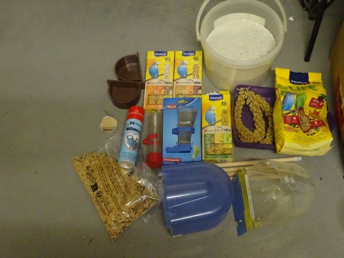 biete Wellensittich Zubehör, Futter, Badehäuser, Tränken, Sand, Stangen.