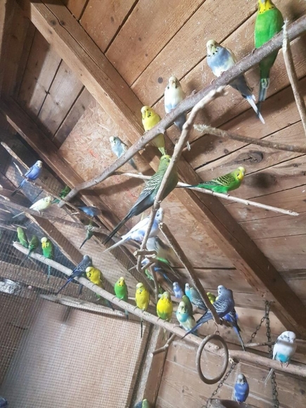 Wellensittiche in verschiedenen Farben und Alter.
