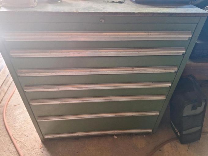 Werkzeugschrank, schwere Ausführung aus Metall. 7 Schubladen mit Unterteilungen.