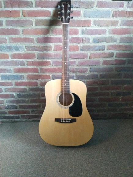 Angeboten wird eine Westerngitarre der Marke Golden Ton. Sie wurde nur sehr wenig bespielt und ist in gutem Zustand. Die Saiten wurden gelockert und müssten zum Bespielen wieder gespannt werden. Dazu gibt es eine Aufbewahrungstasche.