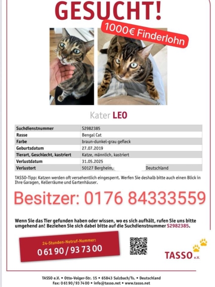 1000€ Finderlohn! Wir suchen unseren Kater schmerzlichst!
