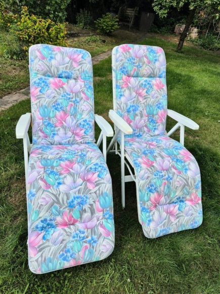 Hallo, ich verkaufe hier aus einer Haushaltsauflösung (Nachlass/Familienbesitz) 2 hochwertige Vintage-Hochlehner mit Fußteil und Originalauflagen mit Blumenmuster in schönen Farben der Marke *Kurz*.