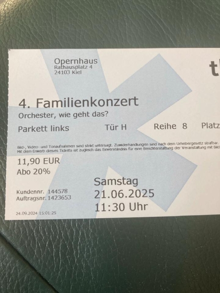 Ich verkaufe 4 Tickets (2 Erwachsene und 2 Schüler) für das 4. Famlienkonzert „Orchester, wie geht das?“ am 21. Juni 2025 um 11.30 Uhr im Kieler Opernhaus. Ich kann die Karten evtl. bringen.