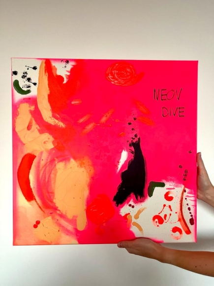 NEON DIVE“ö ist ein energiegeladenes Unikat, das mit seiner knalligen Farbpalette und abstrakten Formensprache zum echten Statement Piece wird. Leuchtendes Neonpink trifft auf Orange, Schwarz, Grün und Apricot – wild, frei und voller Bewegung.