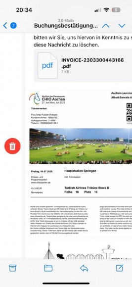 Ich biete 3 Eintrittskarten für das Springen am Freitag, 04.07.2025. Die Tickets werden per E-Mail versandt oder auch gerne als Ausdruck, wenn gewünscht.