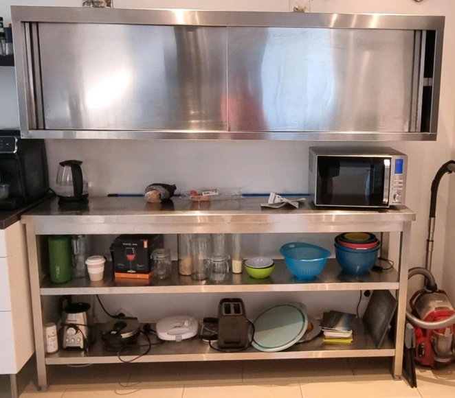 Wir geben diese beiden Edelstahl Küchenschränke ab. Dabei handelt es sich um einem Arbeitstisch mit den Maßen 190cm x 42cm x 90cm (LxBxH). Die Füße sind höhenverstellbar. Außerdem gehört ein Wandschrank mit den Maßen 200cm x 40cm x 60cm (LxBxH) dazu. Beide Schränke weisen eine hohe Tragfähigkeit von insgesamt 160 kg auf. Das Material ist sehr langlebig, einfach zu reinigender und massiver Edelstahl.