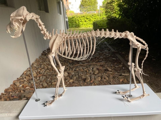 Das Hundeskelett "Olaf" ist ein naturabguss eines mittelgroßen Mischlingshundes mit ca. 45 cm Schulterhöhe. Die Wirbelsäule ist unbeweglich, der Schwanz ist abnehmbar. Die Beine können bewegt und abgenommen werden, ideal auch für Kurse und Weiterbildungen. Der Kiefer ist beweglich aufgehängt, die Zähne sind naturgetreu wiedergegeben.