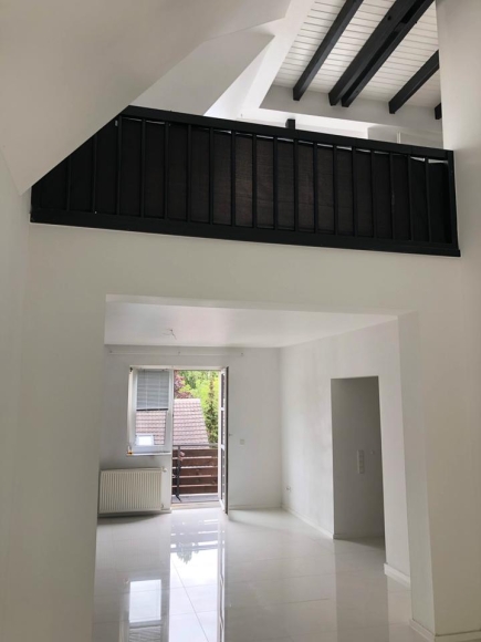 Der untere Bereich ist mit hochwertigen, weißen Fliesen ausgelegt, die obere Etage mit hellem, grauen Laminat. Der Balkon ist zur Südseite ausgerichtet, mit Blick auf den Innenhof (den Sie mitnutzenkönnen), wodurch es sehr ruhig ist und zum sonnen entspannen einlädt.