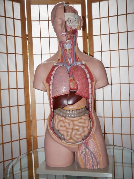An der Puppe (Gesamthöhe: 86cm) lässt sich die Lage der menschlichen Organe sehr gut zeigen. Nach meiner Erfahrung haben die wenigsten PatientInnen eine Vorstellung, wie der Körper aufgebaut ist. Leider hat der Kopf der Puppe einen Riss bekommen und die Leber ist nicht ganz vollständig. Alle weiteren Organe sind gut erhalten und lassen sich einzeln entnehmen. Für eine medizinische Praxis ein „Muss“. (Nur an Selbstabholer)