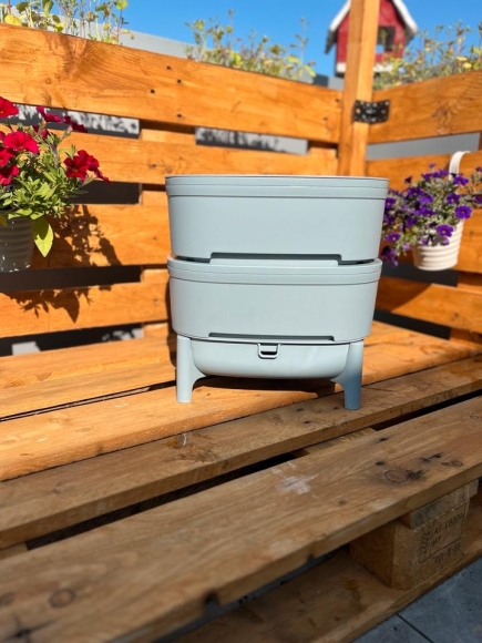 Es wird die Wurmbox von „Wurmkiste.de“ mit einem neuen Filter-Vlies und einer angefangenen Tüte Mineral-Mix verkauft.