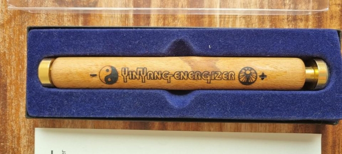 Verkaufe hier aus einem Nachlass einen YinYang-Energizer, er wurde offensichtlich genutzt und leider scheint auf dem Holzstab auch eine Flüssigkeit ausgelaufen zu sein, s.bitte die Fotos. Sicherlich kann man das Holz behandeln und die Flecken minimieren, ich möchte den Stab jedoch so abgeben und ihn in gute Hände geben, die sich auskennen.
