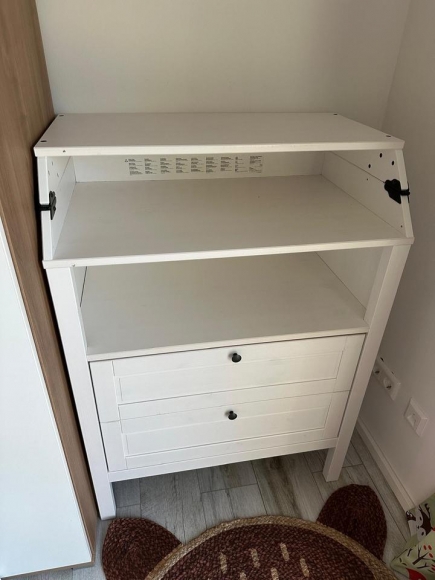 Ich verkaufe hier unsere gern benutzte Wickelkommode „Sundvik“ von IKEA aus Massivholz in sehr gutem Zustand. Mängel habe ich keine entdeckt. Sie hat zwei Schubladen, ein offenes Fach und ist auch später durch Einklappen der Auflage als Schrank/Kommode verwendbar.