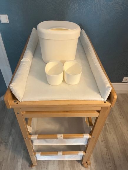 Wickelregal der Marke Roba mit Badewanne und Stoffauflage.