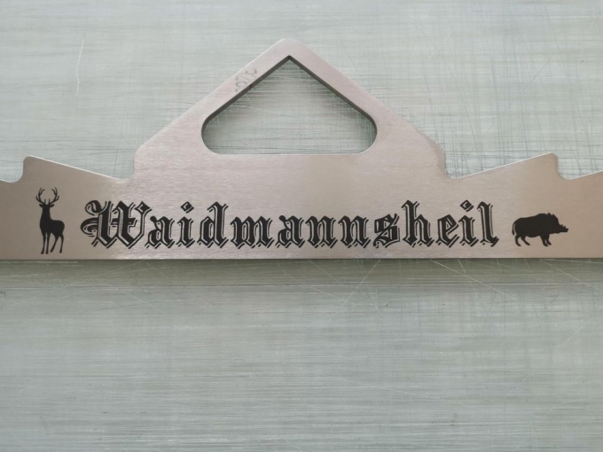 Schriftzug ist auf einer Seite in das Material gelasert, somit lange haltbar und auch leicht zu reinigen.